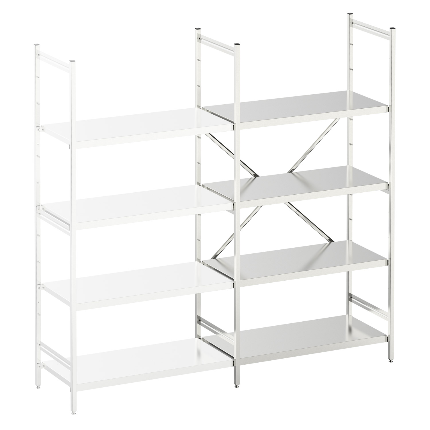 shelves, made from stainless steel, are mounted on uprights with