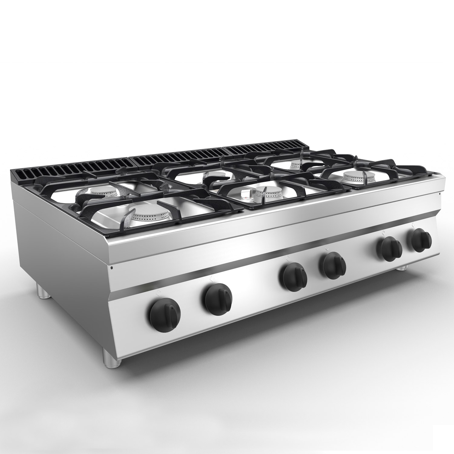– Gas range hobs with 3x 5,7 kW (back) and 7,7 kW + 5,7 kW + 7,7 kW