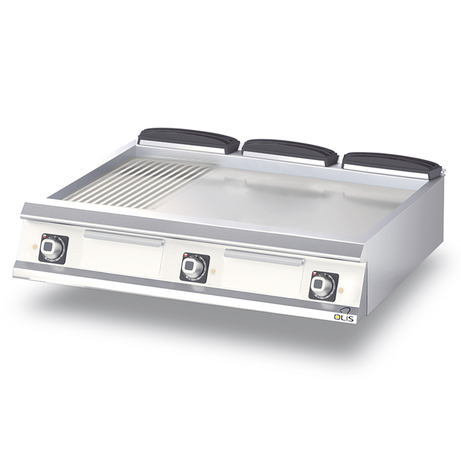 1/3 grooved and 2/3 smooth, a steel surface. The grill has three cooking