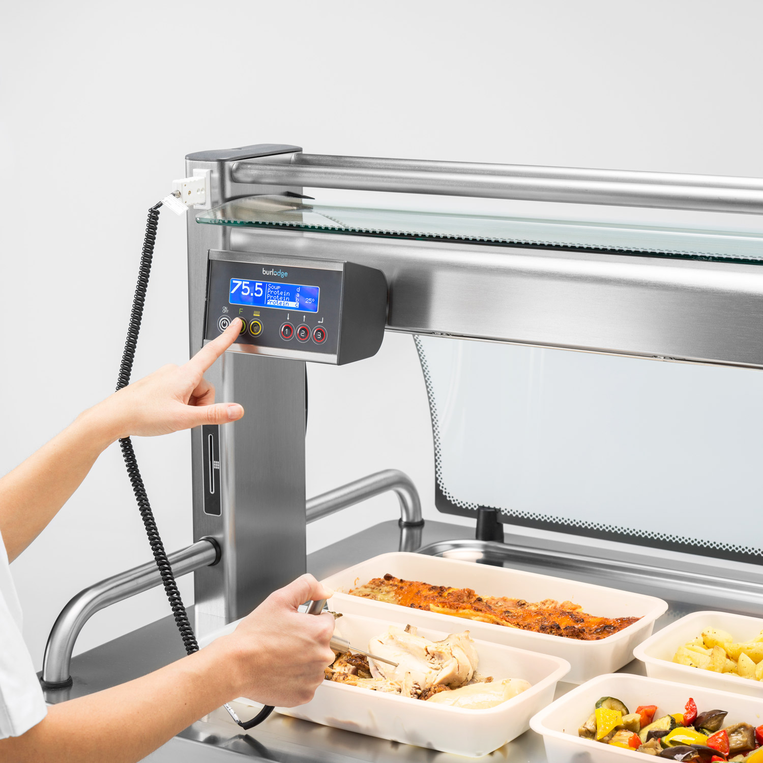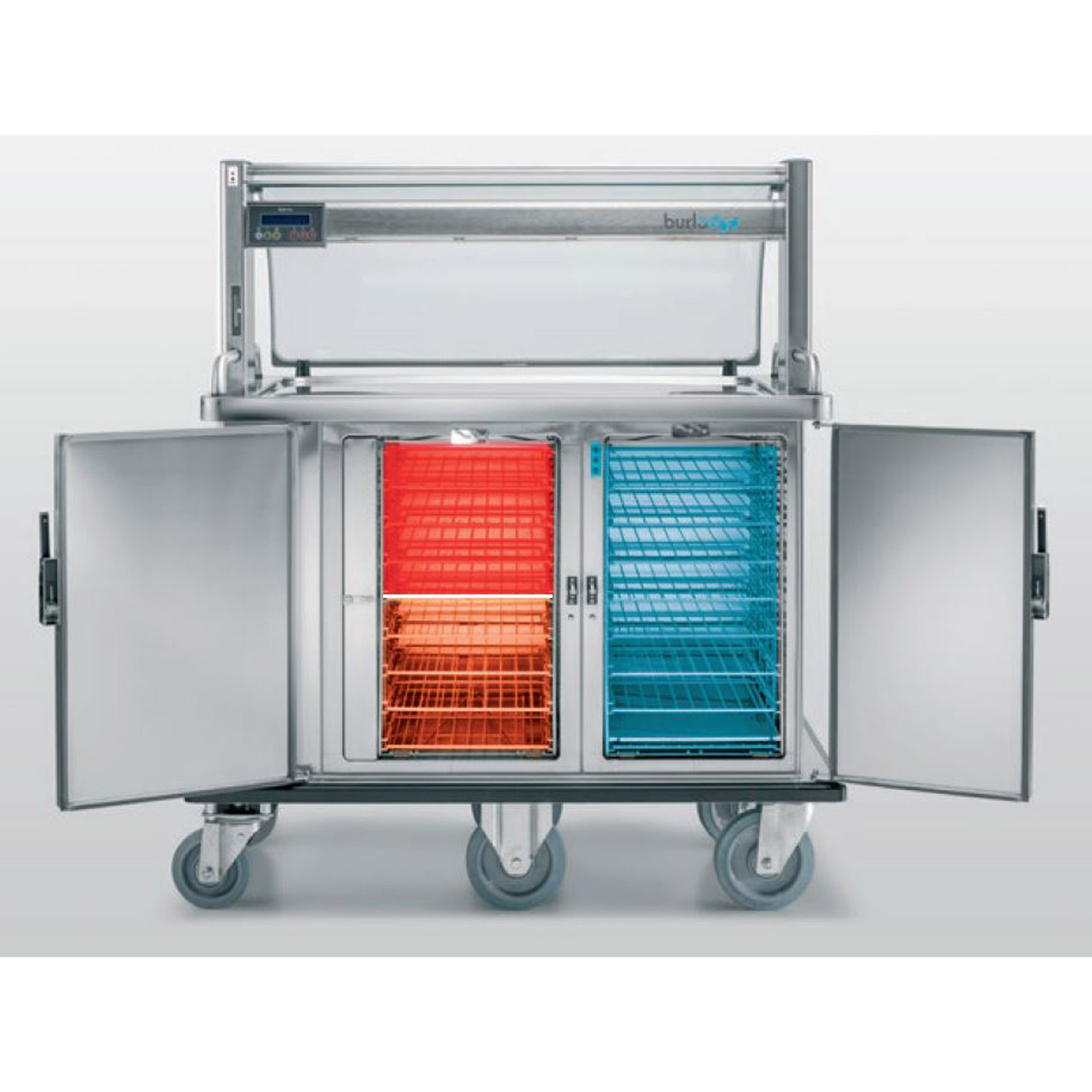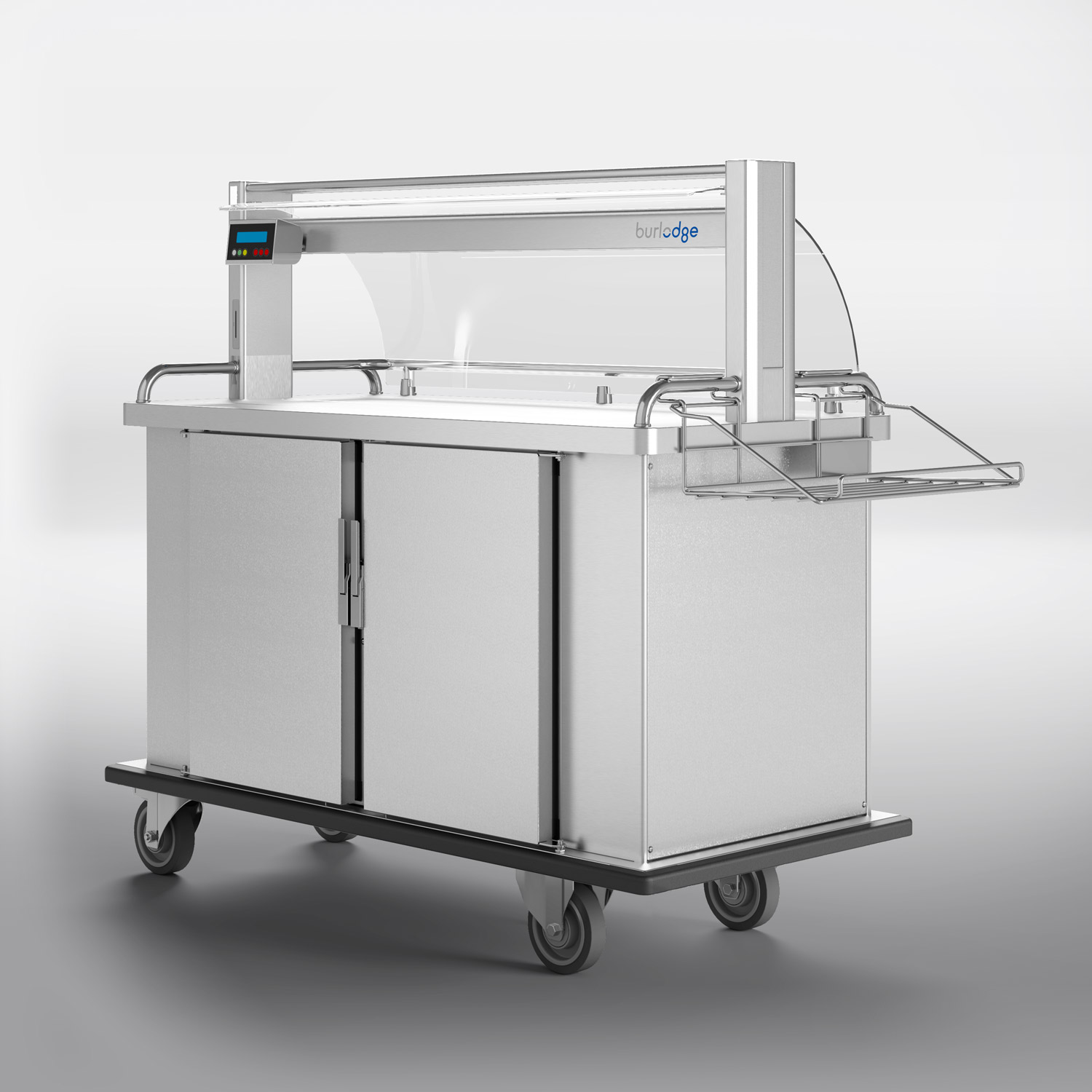 In addition to the durable and light-weight design, the Multigen’s ergonomic features ensure smooth-rolling maneuverability and responsiveness thanks to the unique location of the wheels. The frame, surrounded by a polymer buffer, is made from reliable stainless-steel and is extremely light-weight. The sleek gantry maximizes worktop space and allows for 360-degree visibility. The gantry can be delivered with a heating and lighting system to enhance food presentation and temperature retention. The control panel is conveniently placed at your eye level for quick glance comprehension. Alternatively, the trolley can be delivered without the gantry.