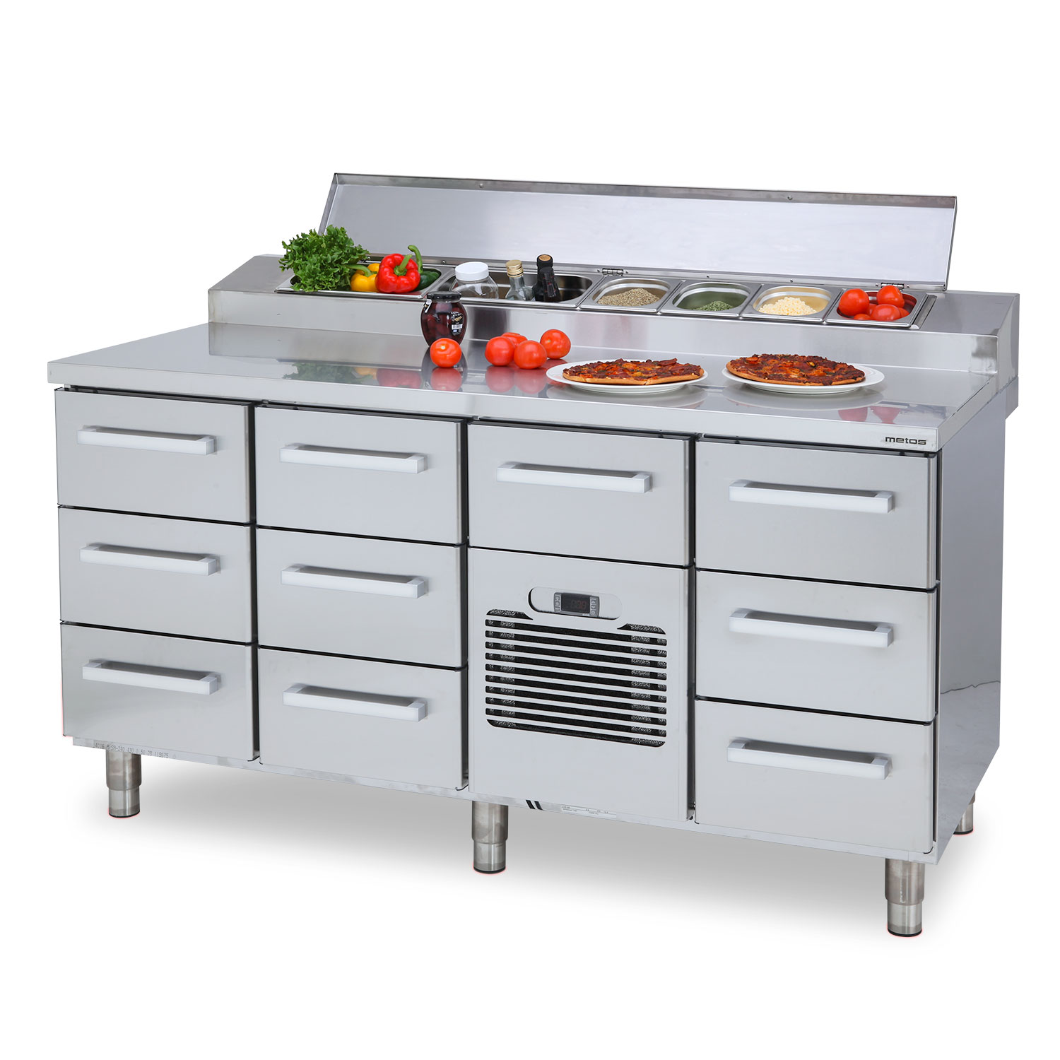 – pizza table with heightened cold basin and cold drawers